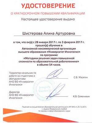 Особенно «плодотворным» для обучения стал месяц февраль: Шистерова Алина Артуровна прошла обучение в АНО ВО «Университет Иннополис» (г. Казань) по программе «Методики решения задач повышенной сложности по образовательной робототехники» (54 часа); Байдерин Леонид Владимирович прошел обучение на Федеральных тренировочных сборах программы «Робототехника: инженерно-технические кадры России.