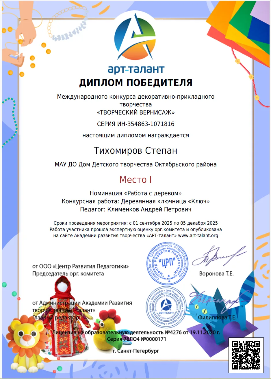 Успех Степана демонстрирует важность занятий прикладным творчеством и подтверждает квалификацию педагога студии. Мы гордимся нашими учениками и продолжаем поддерживать их творческие начинания!